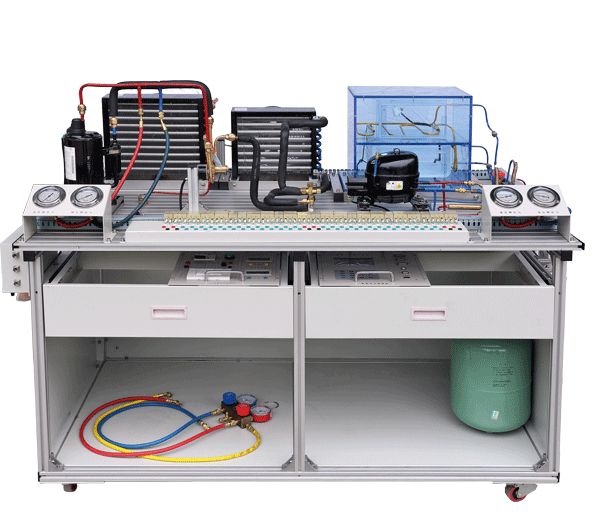 裝置上安裝有冰箱模擬系統(tǒng)和空調(diào)模擬系統(tǒng),可在此裝置上練習(xí)管路制作和安裝,電路安裝,系統(tǒng)找漏、抽空、添加制冷劑等??蓪﹄姳浜涂照{(diào)器自控元件、微電腦控制系統(tǒng)進(jìn)行人為的故障的設(shè)定、故障的診斷與排除操作;對制冷維修中常用的各種工具進(jìn)行認(rèn)知(萬用表、擴(kuò)管器、管刀、改錐、克絲鉗、棘輪扳手、充氣管、接頭、扳手、遙控器)和掌握使用方法。